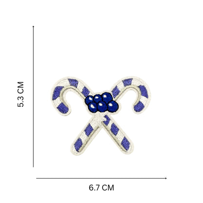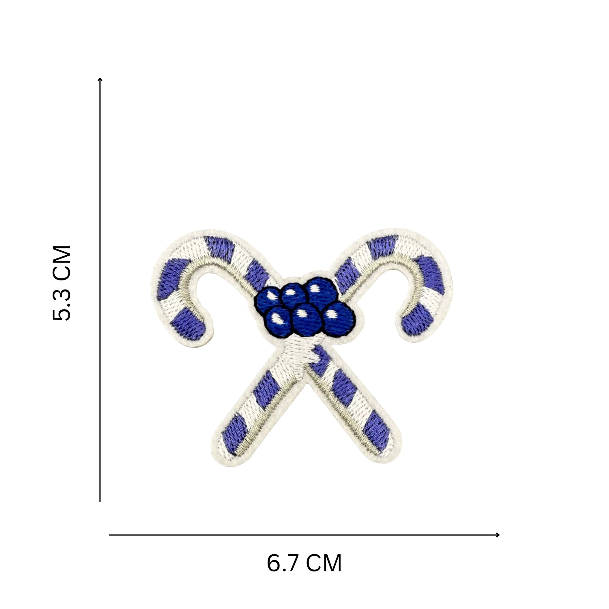 This adorable patch features two crossed candy canes in white and icy blue stripes, tied together with a cluster of midnight blue holly berries at the center, a modern, cool-toned spin on the traditional red and white design. The color combination of frosty white, pale lavender-blue, and deep navy gives it a soft, elegant, and wintry charm that pairs beautifully with cozy fabrics and festive décor.