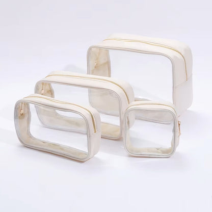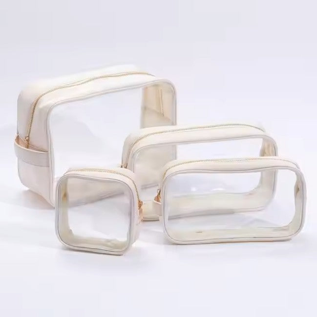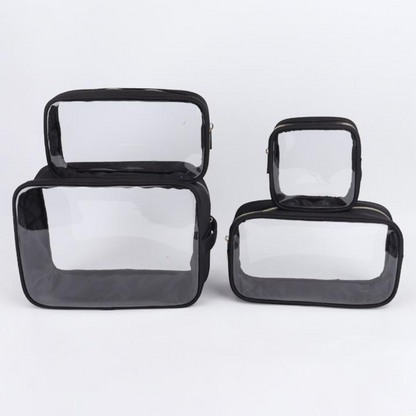 Elegant set of 4 Clear Makeup Bags, made from high-quality PVC and nylon for durability and a luxurious feel.