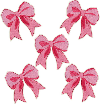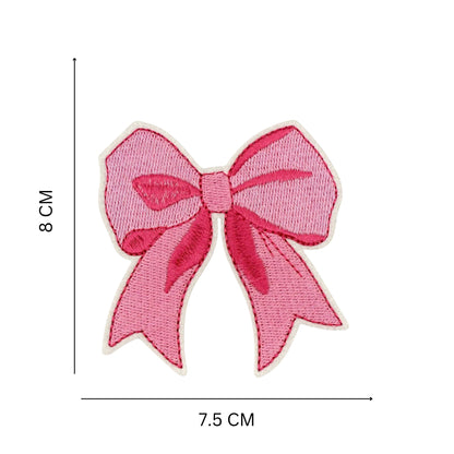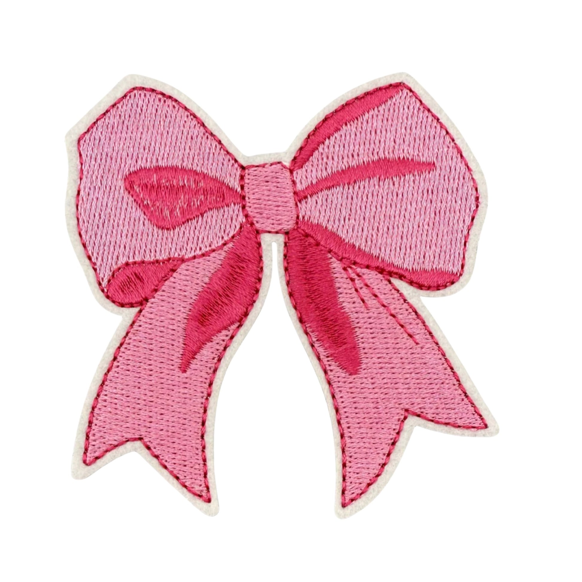 This patch features a two-tone pink bow, with the upper loops in a softer blush pink and the tails and center knot in a deeper, richer pink. The embroidery includes subtle thread shading that creates a realistic, dimensional ribbon effect. The crisp outline adds definition, ensuring the bow stands out beautifully on any fabric.