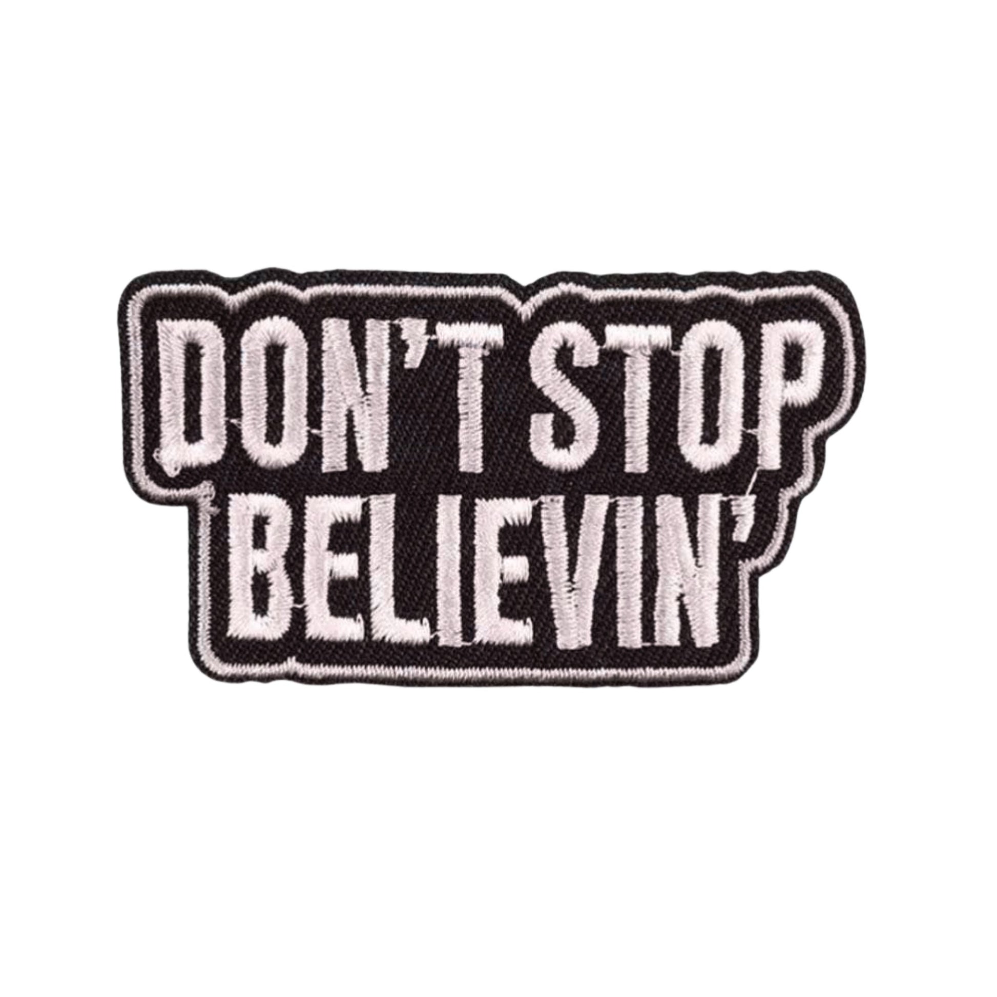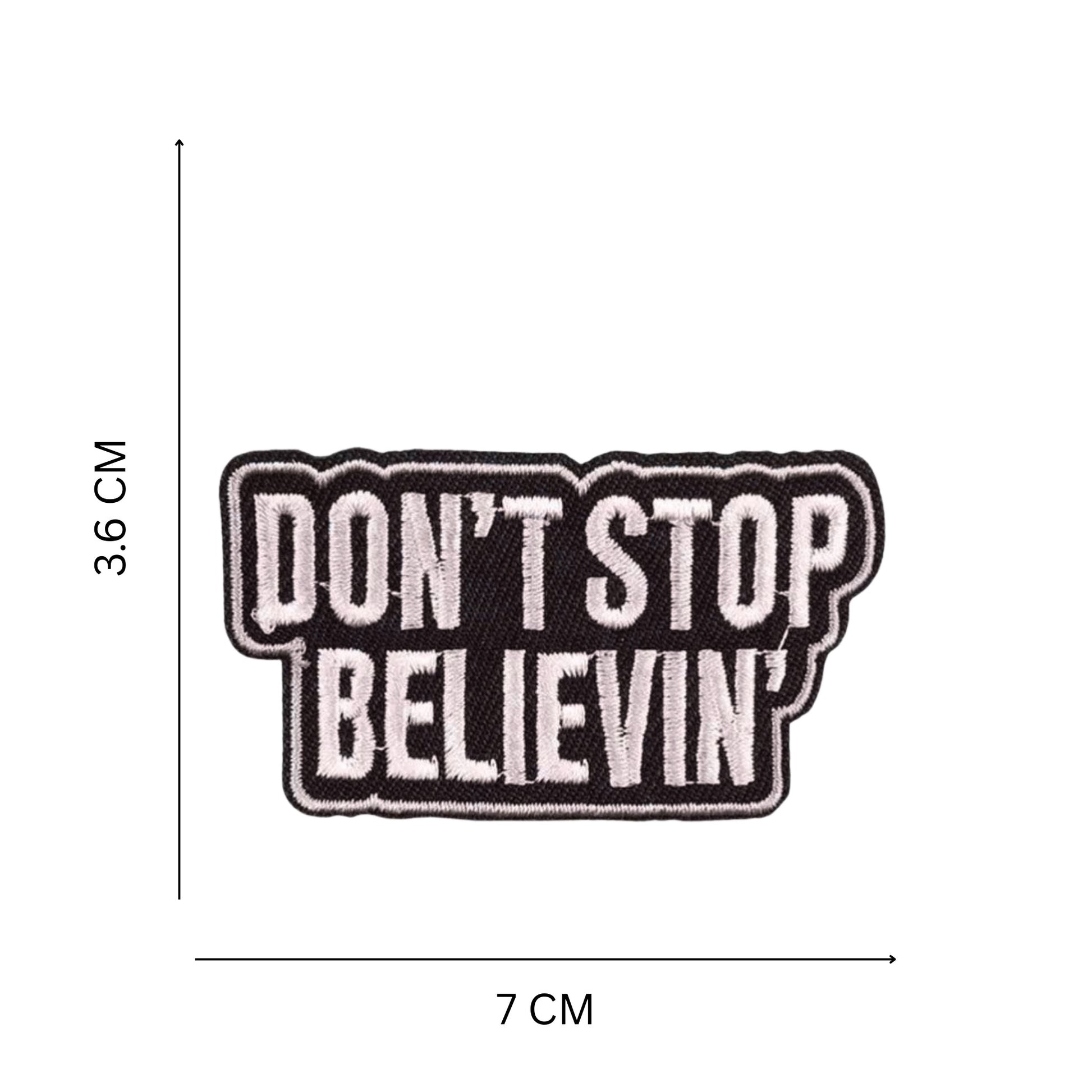 Add a powerful message to your style with this ''Don’t Stop Believin’ Iron On Patch, designed to inspire confidence and motivation through bold typography. Featuring crisp white embroidered lettering on a deep black base, this patch offers a striking contrast that makes the message stand out clearly and confidently.