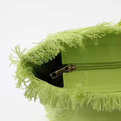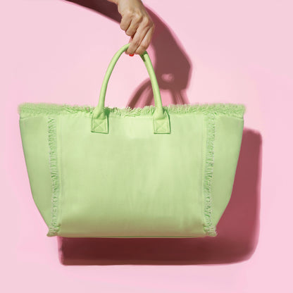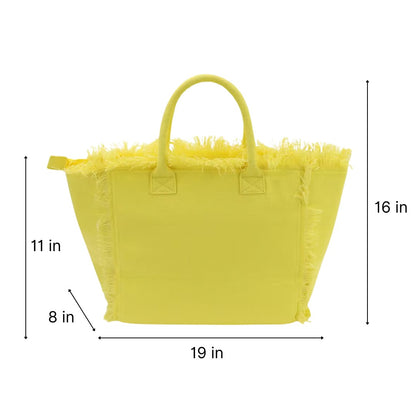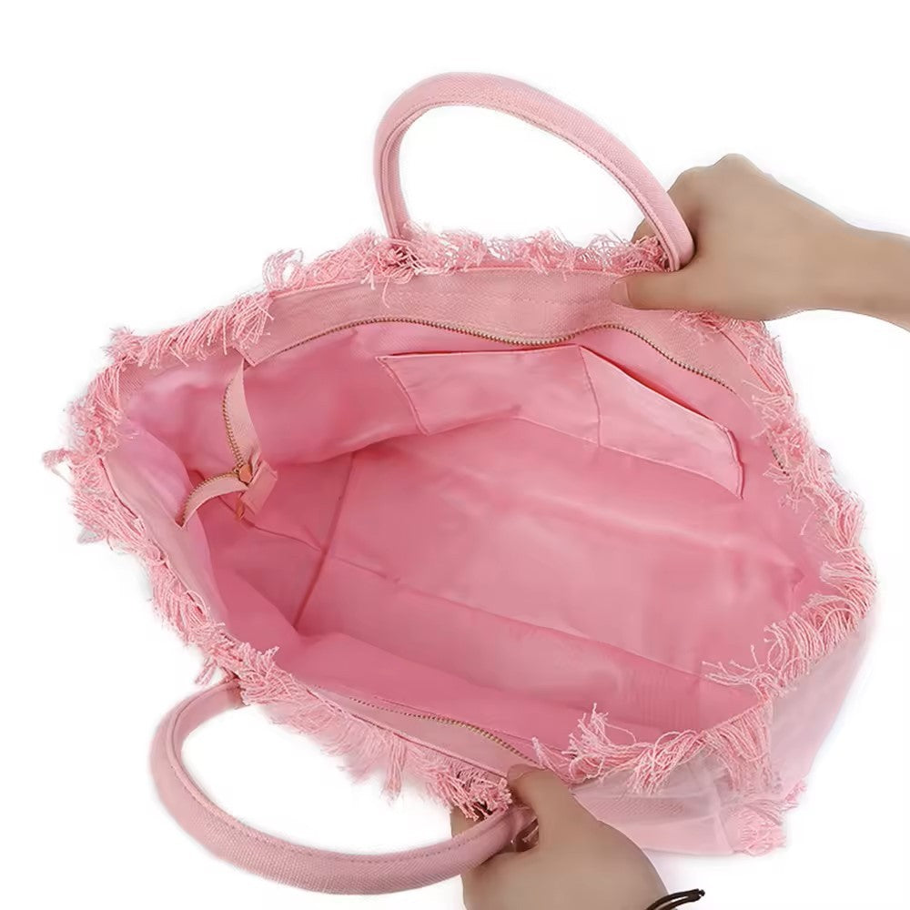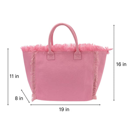 Get ready for sunny days and summer adventures with our must-have canvas tote! Perfect for the pool, beach, or any outdoor event, this spacious tote has everything you need to carry your essentials in style. With its bold design, secure zipper closure, fringed edging, soft lining, and handy interior pocket, this tote is as functional as it is fashionable.