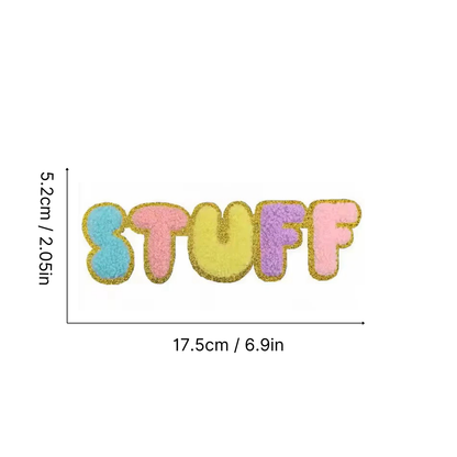 Add a fun and personalized touch to your belongings with this set of Iron-On Chenille Patches/ Sew on featuring the words "Stuff," "Lunch," and "Case." Each patch is crafted from soft, high-quality chenille fabric, providing a textured, cozy feel that enhances your garments, gears and accessories.