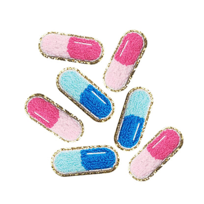 Add a fun pop of color to your outfits with this Pink & Blue Pill Chenille Embroidered Patch. Measuring 6.2 cm x 2.7 cm, this patch features a playful pill capsule design in pink and blue shades, bordered with a shiny gold edge for extra style. Perfect for jackets, denim jeans, backpacks, pouches, and T-shirts, this patch can be easily iron-on. Ideal for DIY lovers, crafters, and anyone who enjoys trendy embroidered patches.