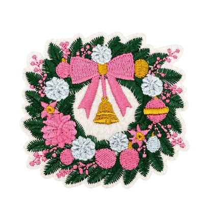 This festive patch features a lush green wreath crafted from fine embroidered pine leaves, adorned with delicate pink berries, white snow-like florals, and soft gold ornaments. At the center sits a large pink bow tied with a golden bell, the perfect finishing detail that gives this patch a timeless Christmas charm.